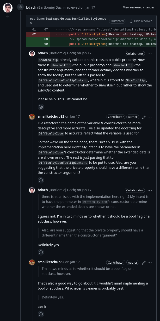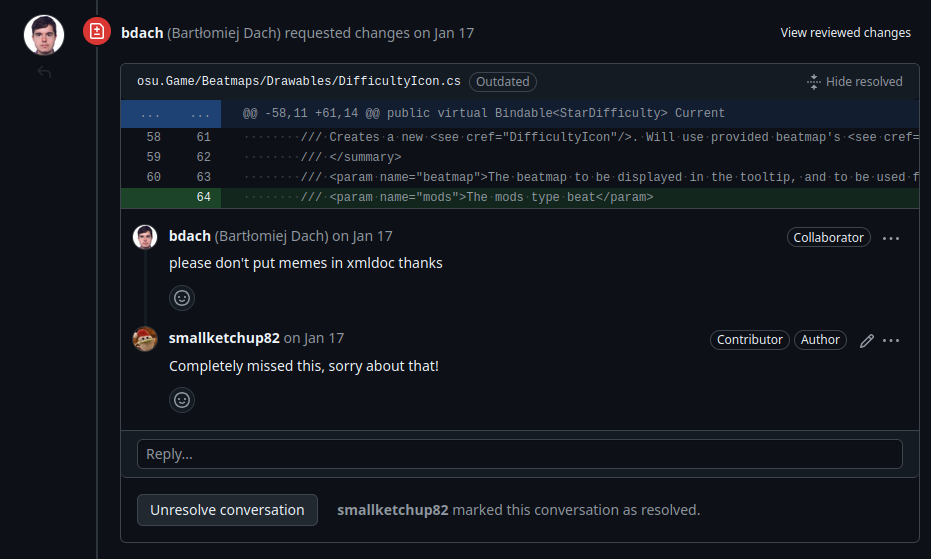 When I got the review, I was obviously embarrassed. I had only myself to blame for not reviewing my own code before submitting it. But, I was also grateful. The reviewer got to the point and told me exactly what was wrong with my code. I fixed it and re-requested review. While the PR was still a mess, it got merged and I was pretty happy with myself. I had just contributed to osu!, something I never thought I’d be able to do, and it was pretty cool.