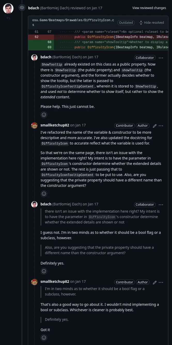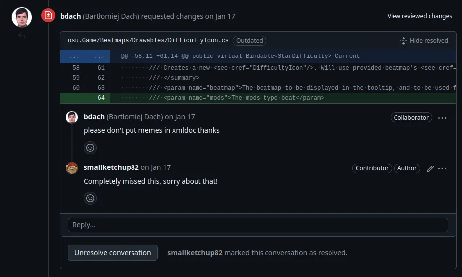 When I got the review, I was obviously embarrassed. I had only myself to blame for not reviewing my own code before submitting it. But, I was also grateful. The reviewer got to the point and told me exactly what was wrong with my code. I fixed it and re-requested review. While the PR was still a mess, it got merged and I was pretty happy with myself. I had just contributed to osu!, something I never thought I’d be able to do, and it was pretty cool.