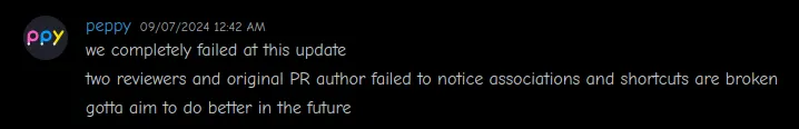 As you can guess, shit hit the fan. As with my first PR, not testing your code is a free gateway to programmer hell. Me, Smoogi, and peppy tested both PR’s and peppy merged them in.